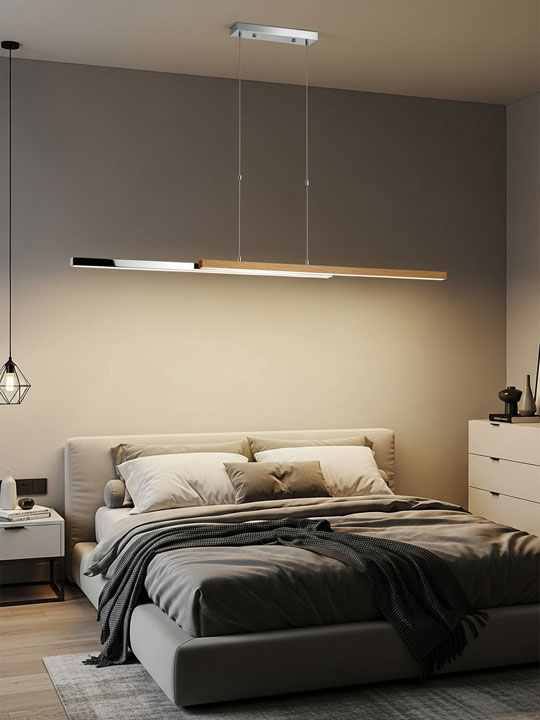 Clean lines and confident geometry define the minimalist linear suspension pendant. This long, narrow fixture works beautifully over a bed frame or floating above a low-profile headboard, offering even, ample illumination.