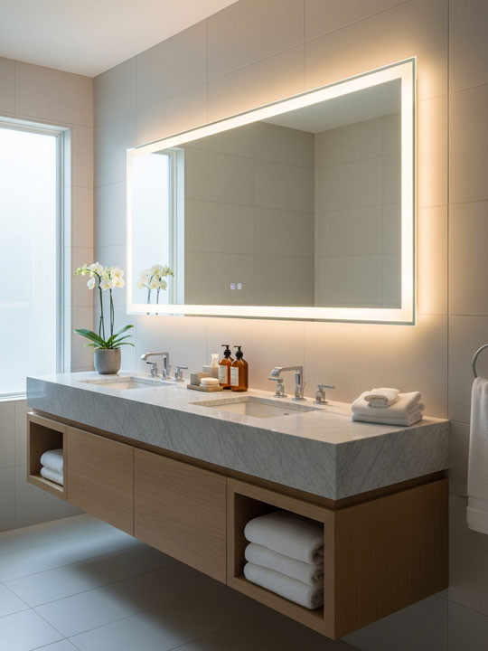 Mirrors and lighting are a perfect pairing—each enhances the other. Strategically placing lights around or above a mirror not only provides excellent illumination for grooming or makeup but also helps bounce light around the room, making the space feel larger and brighter.